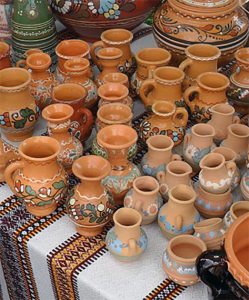 „Горы горшков, закутанных в сено, медленно двигались, кажется, скучая своим заключением и темнотою; местами только какая-нибудь расписанная ярко миска или макитра хвастливо выказывалась <...> Много прохожих поглядывало с завистью на высокого гончара, владельца сих драгоценностей <...> глиняных своих щеголей и кокеток <...>“. Такая картина нарисована Гоголем в самом начале „Сорочинской ярмарки“. И нет сомнений, что вся эта красота родом была из Опошни.