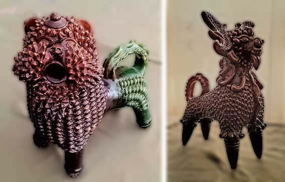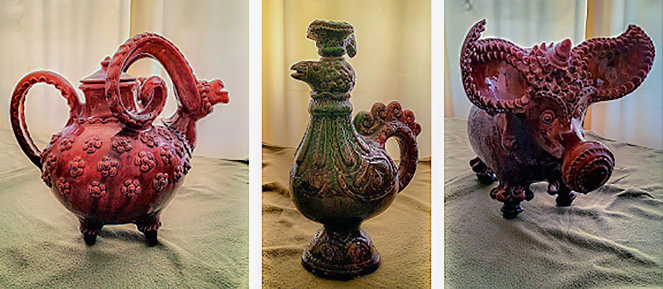Юмористическая карнавализация опошнянской керамики включает наполнение пародийным, провокативным содержанием формы изделий бытового назначения. Прежде всего это изделия предназначенные для наполнения их алкоголем и другими напитками. На иллюстрациях показаны керамические варианты характерных для народных украинских вышивок на рушниках и скатертях козлов и „левiв“ (львов). Они представляют собой сосуды для вина (имеется на них керамическая пробка на отверстие для наполнения формы и есть отверстие для выливания содержимого). Но это, конечно, прежде всего смешная скульптура.